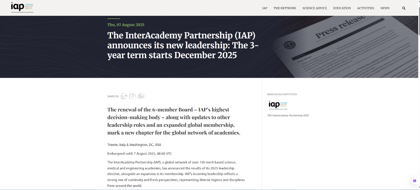 Монгол Улсын ШУА-ийн эрдэмтэн Академи хоорондын түншлэл (Interacademy Partnership (IAP)) олон улсын байгууллагын хорооны гишүүнээр сонгогдлоо